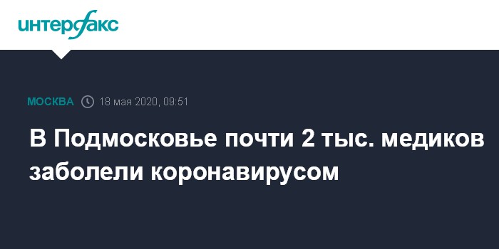 Москва. 18 мая. INTERFAX.RU - Около 10% медиков, работающих в больницах Подмосковья, заболели коронавирусной инфекцией, сообщила министр здравоохранения Московской области Светлана Стригункова.