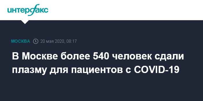 Москва. 20 мая. INTERFAX.RU - Более 540 человек в Москве стали донорами плазмы для лечения пациентов с COVID-19.