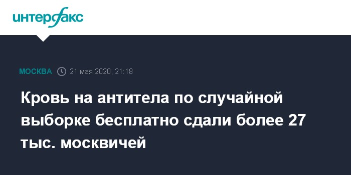 Кровь на антитела по случайной выборке бесплатно сдали более 27 тыс. москвичей