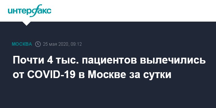 Москва. 25 мая. INTERFAX.RU - В Москве за последние сутки выздоровело еще 3746 пациентов после прохождения лечения от коронавирусной инфекции, рассказала заммэра столицы по вопросам социального развития Анастасия Ракова журналистам в понедельник.