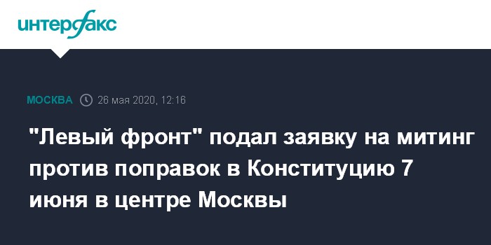 Москва. 26 мая. INTERFAX.RU - Представители движения "Левый фронт" подали в правительство Москвы заявку на проведение первого после ограничений из-за коронавируса митинга - оппозиционеры хотят провести акцию за увеличение социальной поддержки и против принятия поправок в Конституцию 7 июня в 13:00 на площади Революции.