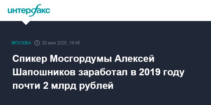 Москва. 30 мая. INTERFAX.RU - Задекларированный доход председателя Мосгордумы Алексея Шапошникова в 2019 году оказался значительно больше всех остальных депутатов столичного парламента - почти 2 млрд рублей.