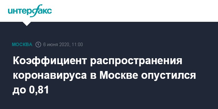 Москва. 6 июня. INTERFAX.RU - Коэффициент распространения инфекции в Москве в продолжил снижение, опустившись до 0,81 (накануне 0,83; 4 июня - 0,90). В России коэффициент также опустился - до 0,97 (накануне - 0,98; 4 июня - - 1,0). Коэффициенты выросли в первых числах июня, поднявшись выше единицы, однако затем вновь отскочили вниз.
