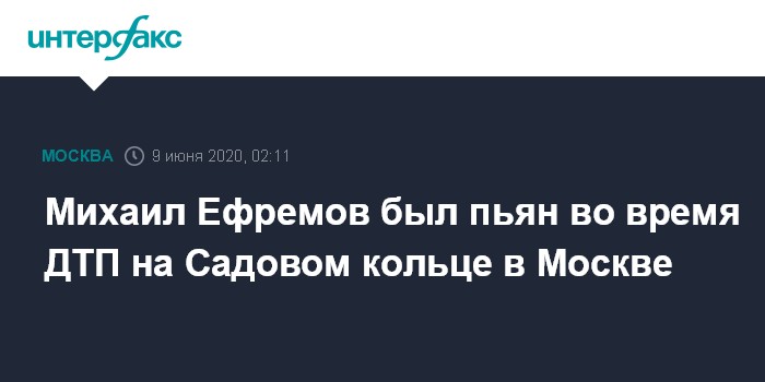 Москва. 9 июня. INTERFAX.RU - Медосвидетельствание подтверждает состояние алкогольного опьянения у виновника аварии на Смоленской площади в Москве актера Михаила Ефремова, сообщил начальник пресс-службы Главного управления МВД России по Москве Владимир Васенин.