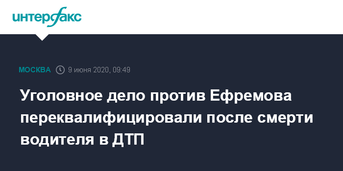 Москва. 9 июня. INTERFAX.RU - Уголовное дело в отношении артиста Михаила Ефремова, ставшего участником смертельного ДТП на Смоленской площади в столице, переквалифицировано в более тяжкое, сообщил "Интерфаксу" во вторник начальник пресс-службы Главного управления МВД России по Москве Владимир Васенин.