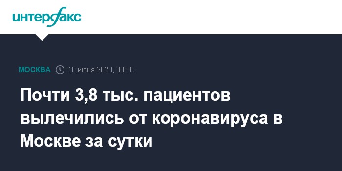 Москва. 10 июня. INTERFAX.RU - В Москве за последние сутки выздоровели еще 3796 пациентов после прохождения лечения от коронавирусной инфекции, сообщила заммэра Москвы по вопросам социального развития Анастасия Ракова.