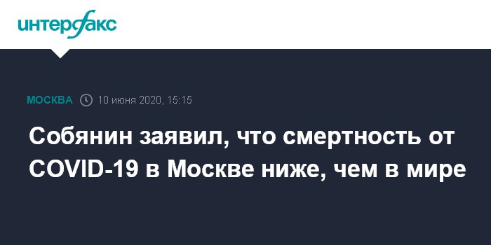 Москва. 10 июня. INTERFAX.RU - Смертность от коронавируса нового типа в Москве ниже, чем в других городах мира, по предварительным данным, всего в столице умерли более 5,2 тысячи человек с диагнозом COVID-19, сообщил мэр Москвы Сергей Собянин.