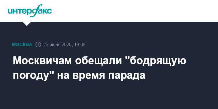 Москва. 23 июня. INTERFAX.RU - В среду утром, во время парада Победы в Москве будет нежаркая погода, но и без дождей, пообещал научный руководитель Гидрометцентра России Роман Вильфанд. По его словам, ночью в городе ожидается плюс 7-12 градусов, днем - 23-25.