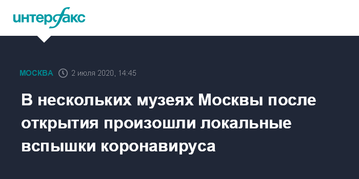 Москва. 2 июля. INTERFAX.RU - В нескольких музеях Москвы за первые две недели после начала приема посетителей произошли локальные вспышки коронавируса, заболели по 3-4 человека, сообщил начальник управления музейно-выставочной службы департамента культуры столицы Антон Горянов.