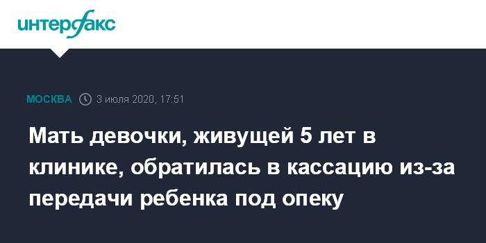 Москва. 3 июля. INTERFAX.RU - Защита матери девочки, которая все пять лет своей жизни находится в перинатальном центре в Москве, обратилась в кассационный суд с жалобой на решение суда об ограничении родительских прав и передачу ребенка на попечение в органы опеки, сообщили "Интерфаксу" в суде.