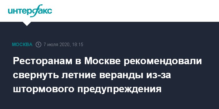 "В связи с тем, что в Москве в ближайшие часы ожидается дождь, местами сильный, гроза и усиление ветра до 20 м/с, просим все предприятия общественного питания, имеющие летние веранды, своевременно принять меры по прекращению их эксплуатации", - сообщили "Интерфаксу" в пресс-службе департамента во вторник.