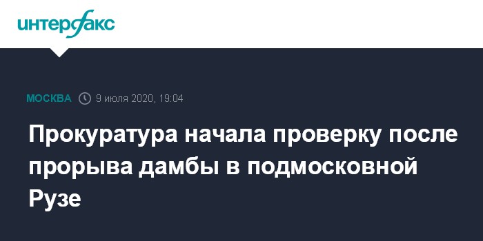 Москва. 9 июля. INTERFAX.RU - По факту прорыва дамбы и затопления домов в подмосковной Рузе началась прокурорская проверка, сообщили "Интерфаксу" в Мособлпрокуратуре в четверг.