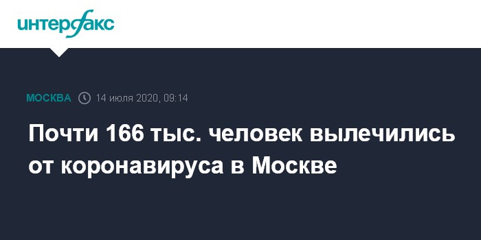 Москва. 14 июля. INTERFAX.RU - В Москве от коронавируса вылечились почти 166 тысяч человек, сообщила журналистам заместитель мэра столицы по вопросам социального развития Анастасия Ракова.