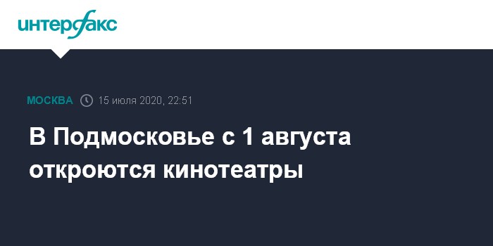 Москва. 15 июля. INTERFAX.RU - В Московской области с 1 августа вновь заработают кинотеатры и возобновится проведение мероприятий, организуемых органами исполнительной власти, следует из постановления губернатора Московской области.