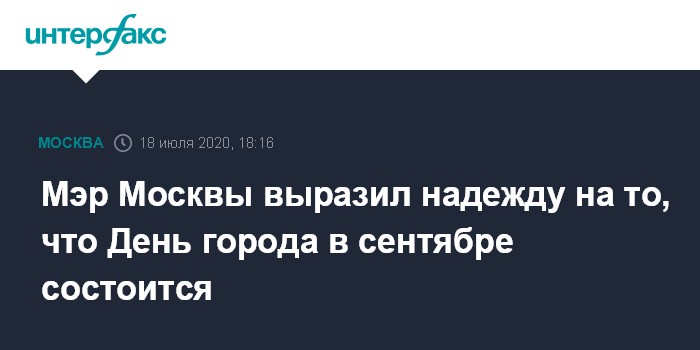 Москва. 18 июля. INTERFAX.RU - В сентябре в столице состоится празднование Дня города, что станет первым крупным мероприятием после пандемии коронавируса, заявил мэр Сергей Собянин в эфире радиостанции "Комсомольская правда".