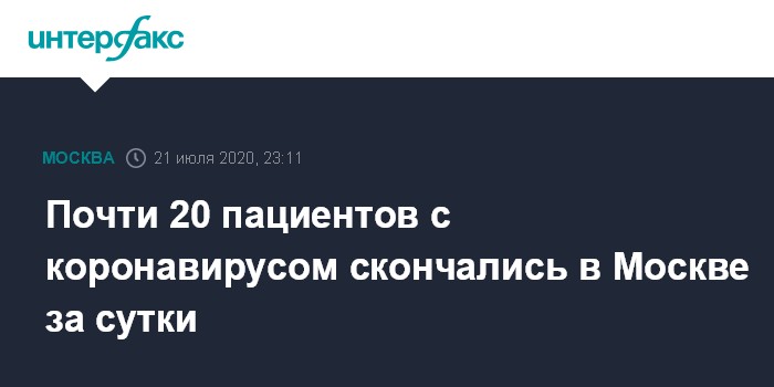 Москва. 21 июля. INTERFAX.RU - В Москве скончались 19 пациентов с подтвержденным диагнозом пневмония и положительным результатом тестов на коронавирус, сообщили "Интерфаксу" в оперштабе по контролю и мониторингу ситуации с коронавирусом в Москве.