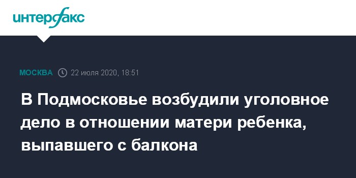 Москва. 22 июля. INTERFAX.RU - В отношении матери двухлетнего мальчика, случайно упавшего с балкона в Подольске, возбуждено уголовное дело об оставлении в опасности.