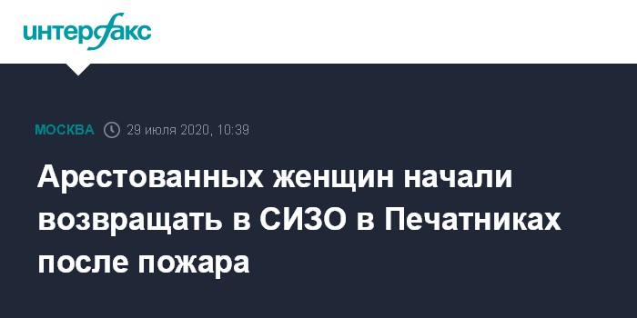 Москва. 29 июля. INTERFAX.RU - В Москве арестованных начали возвращать в женский СИЗО-6 в Печатниках, откуда их временно выселили после пожара 27 июля. Состояние камер позволяет снова их заселить, сообщил представитель регионального УФСИН Сергей Цыганков.