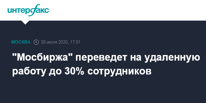 Москва. 30 июля. INTERFAX.RU - "Московская биржа" переведет до 30% своих сотрудников на постоянную удаленную работу, сказал член правления, управляющий директор по продажам и развитию бизнеса компании Игорь Марич. Ранее о таких планах сообщили в Сбербанке.