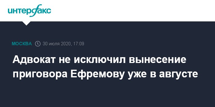 Москва. 30 июля. INTERFAX.RU - Приговор артисту театра и кино Михаилу Ефремову по делу о пьяном ДТП может быть вынесен уже в августе, заявил адвокат потерпевшей стороны Александр Добровинский.