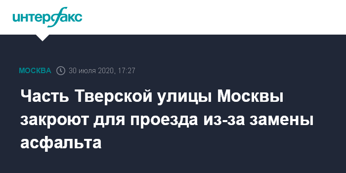 Москва. 30 июля. INTERFAX.RU - На участке Тверской улицы от Моховой улицы до Настасьинского переулка полностью заменят асфальт по технологии укладки "единым ковром", из-за чего движение на этом участке общей протяженностью 1,3 км будет полностью перекрыто для автотранспорта, сообщил заммэра Москвы Петр Бирюков журналистам в четверг.