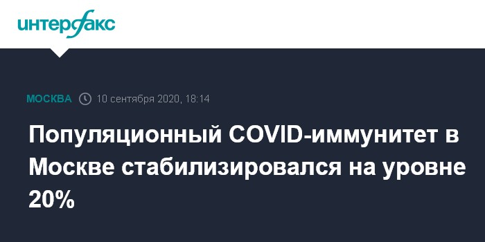 Москва. 10 сентября. INTERFAX.RU - Уровень популяционного иммунитета к COVID-19 среди населения остановился на уровне 20%, сообщила заммэра столицы по вопросам социального развития Анастасия Ракова в интервью телеканалу "Россия 24" (ВГТРК) в четверг.