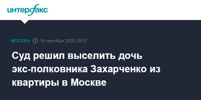 Москва. 16 сентября. INTERFAX.RU - Замоскворецкий районный суд столицы принял решение о выселении 12-летней дочери экс-полковника МВД Дмитрия Захарченко Ульяны и ее матери Марины Семыниной из их единственной квартиры в Москве, пишет в среду "Коммерсантъ" со ссылкой на их адвоката.