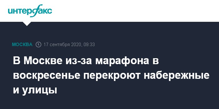 Москва. 17 сентября. INTERFAX.RU - Дорожное движение 20 сентября в Москве будет перекрыто на многих набережных и центральных улицах из-за Московского марафона, сообщили "Интерфаксу" в пресс-службе Центра организации дорожного движения.