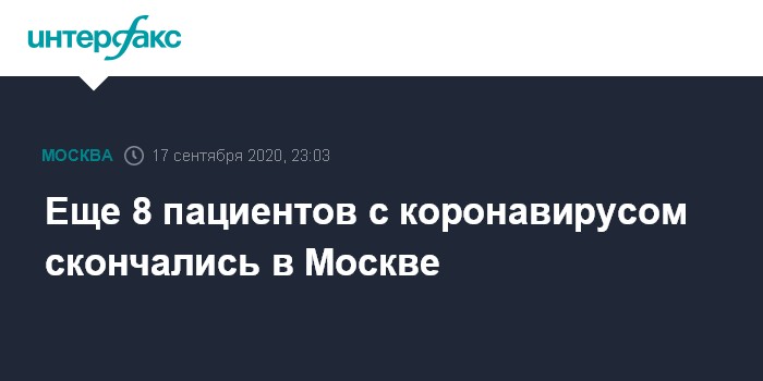 "В Москве скончались 8 пациентов, у всех был подтвержден диагноз пневмония и получен положительный результат тестов на коронавирусную инфекцию", - сообщили "Интерфаксу" в оперштабе по контролю и мониторингу ситуации с коронавирусом в Москве.