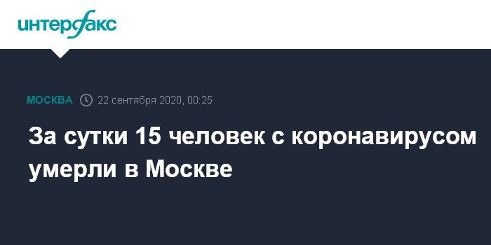 Москва. 22 сентября. INTERFAX.RU - За минувшие сутки в Москве умерли 15 пациентов с пневмонией и положительным тестом на коронавирус, сообщили "Интерфаксу" в оперштабе по контролю и мониторингу ситуации с коронавирусом в Москве.