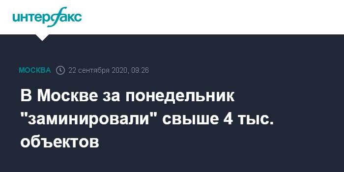 Москва. 22 сентября. INTERFAX.RU - Неизвестные по каналам экстренных служб Москвы сообщили в понедельник, 21 сентября, о якобы заложенных взрывных устройствах на территории свыше 4000 объектов, сообщил "Интерфаксу" во вторник источник, знакомый с ситуацией.