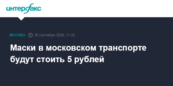 Москва. 30 сентября. INTERFAX.RU - С 1 октября маски во всем московском транспорте станут дешевле, пассажиры смогут купить их за 5 рублей, сообщили в пресс-службе столичного департамента транспорта.