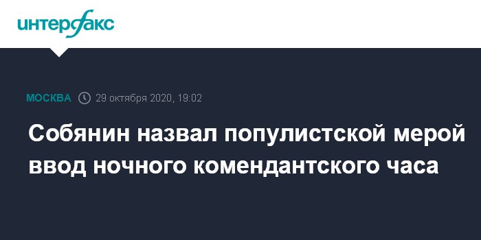 "Мне забавно видеть, когда вводят комендантский час с 23:00 до 6:00, я не очень понимаю, что там такое ночью происходит в этих городах, что нужно вводить комендантский час", - сказал Собянин в интервью телеканалу "Россия-1" (ВГТРК).