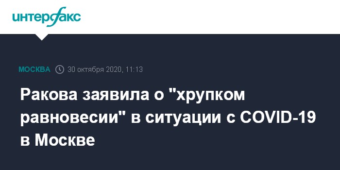 Москва. 30 октября. INTERFAX.RU - В настоящее время в столице наблюдается "хрупкое равновесие" в заболеваемости коронавирусом, заявила заммэра Москвы по вопросам социального развития Анастасия Ракова в интервью телеканалу "Россия 24" (ВГТРК), вышедшем в пятницу.