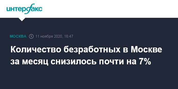 Москва. 11 ноября. INTERFAX.RU - Количество безработных в российской столице в октябре снизилось почти на 7%. Об этом сообщил заммэра Москвы по вопросам экономической политики и имущественно-земельных отношений Владимир Ефимов в ходе форума "Сильные идеи для нового времени" в среду.