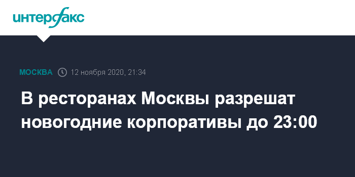 Москва. 12 ноября. INTERFAX.RU - Новогодние корпоративные мероприятия разрешат проводить в ресторанах Москвы, но с ограничениями, обусловленными требованиями Роспотребнадзора и столичных властей. Об этом сообщил в четверг первый замглавы аппарата мэра и правительства Москвы Алексей Немерюк.