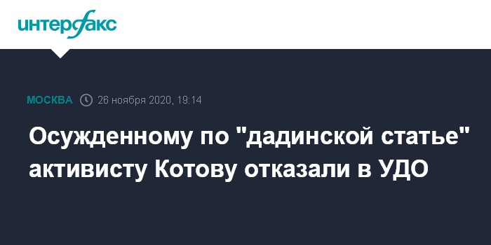Москва. 26 ноября. INTERFAX.RU - Петушинский районный суд Владимирской области отказался удовлетворить ходатайство об условно-досрочном освобождении активиста Константина Котова, приговоренного к полутора годам колонии общего режима по так называемой дадинской статье, сообщил "Интерфаксу" его адвокат Михаил Бирюков.