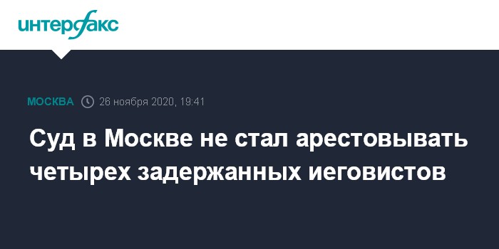 Москва. 26 ноября. INTERFAX.RU - Пресненский суд Москвы в четверг не стал арестовывать четверых задержанных сторонников движения "Свидетелей Иеговы" (признана в РФ экстремистской организацией и запрещена - ИФ).