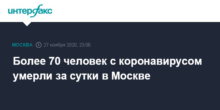 Москва. 27 ноября. INTERFAX.RU - За минувшие сутки в Москве скончались 76 человек в пневмонией и положительным тестом на коронавирус, сообщил столичный оперштаб по контролю за коронавирусом в пятницу. Этот показатель сравним со смертностью в начале июня.