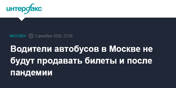 Москва. 2 декабря. INTERFAX.RU - После окончания ограничительных мер, связанных с пандемией коронавируса, водители наземного транспорта не возобновят продажу билетов за наличные, заявил заммэра столицы по вопросам транспорта Максим Ликсутов в эфире радиостанции "Эхо Москвы" в среду.