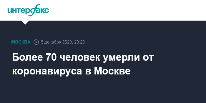 Москва. 5 декабря. INTERFAX.RU - За минувшие сутки в Москве скончались 72 человека с пневмонией и положительным тестом на коронавирус, сообщил столичный оперштаб по контролю за коронавирусом в субботу. Этот показатель сравним со смертностью в начале июня.