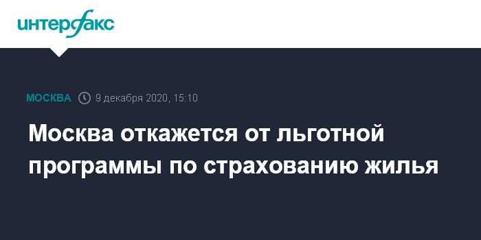 Москва. 9 декабря. INTERFAX.RU - Правительство Москвы отказывается от продления льготной программы по страхованию жилья на 2021 год. Об этом заявил "Интерфаксу" президент Всероссийского союза страховщиков (ВСС) Игорь Юргенс.