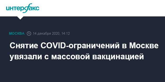 Москва. 14 декабря. INTERFAX.RU - Отмена ограничительных мер, действующих в Москве в связи с пандемией коронавируса, возможна с масштабной вакцинацией от инфекции, заявил заммэра столицы по вопросам экономической политики и имущественно-земельных отношений Владимир Ефимов журналистам в понедельник.