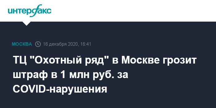 Москва. 16 декабря. INTERFAX.RU - Торговому центру "Охотный ряд" в центре Москвы грозит штраф на сумму до 1 млн рублей или закрытие на срок до 90 суток за нарушения мер профилактики COVID-19, сообщил в среду главный инспектор объединения административно-технических инспекций (ОАТИ) столицы Руслан Блинов.