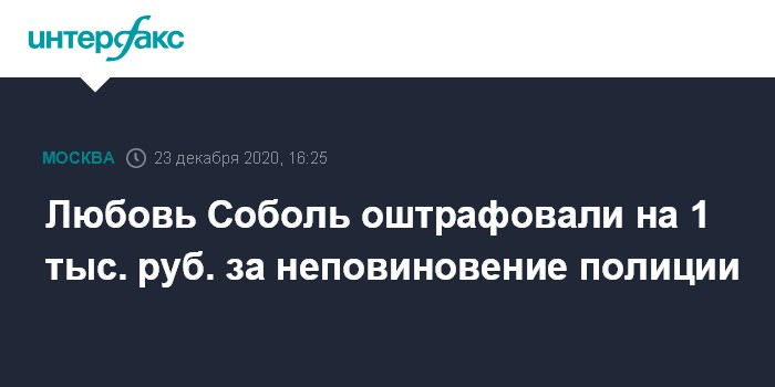 Москва. 23 декабря. INTERFAX.RU - Перовский суд Москвы назначил штраф в 1 тыс. руб. юристу "Фонда борьбы с коррупцией" (ФБК) Алексея Навального Любови Соболь за неповиновение сотруднику полиции, сообщили "Интерфаксу" в среду в пресс-службе суда.