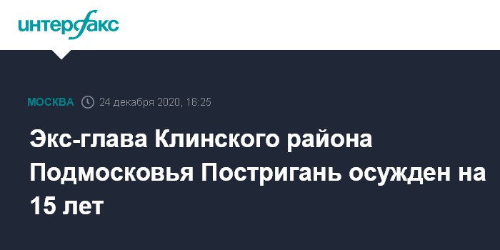Москва. 24 декабря. INTERFAX.RU - Клинский городской суд Московской области приговорил к 15 годам колонии строгого режима бывшего главу района Александра Постриганя по делу о взяточничестве и превышении полномочий. Об этом сообщили "Интерфаксу" в пресс-службе Генпрокуратуры РФ.