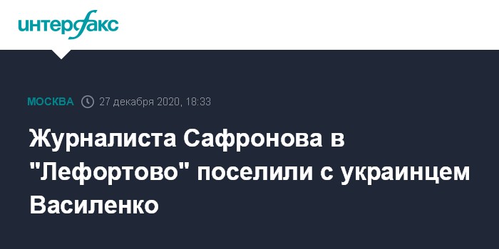 Москва. 27 декабря. INTERFAX.RU - Журналиста Ивана Сафронова, обвиняемого в госизмене, поместили в камеру с украинцем Василием Василенко, осужденным за шпионаж, сообщила в воскресенье член Общественной наблюдательной комиссии (ОНК) Москвы Марина Литвинович.
