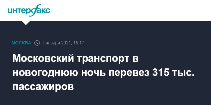 Москва. 1 января. INTERFAX.RU - В новогоднюю ночь в Москве, когда метро и МЦК (Московское центральное кольцо) работали без перерывов, а более сотни маршрутов наземного общественного транспорта - до 03:30, ими воспользовались более трехсот тысяч человек.