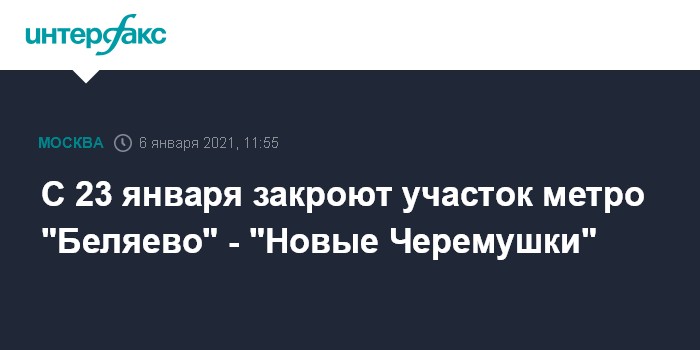 Москва. 6 января. INTERFAX.RU - Участок Калужско-Рижской линии "Беляево" - "Новые Черемушки" будет закрыт с 23 января на две недели, сообщили в среду в пресс-службе департамента транспорта Москвы.