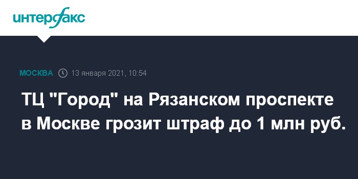 Москва. 13 января. INTERFAX.RU - Торговый центр "Город" на Рязанском проспекте в Москве могут оштрафовать на сумму до 1 млн рублей за нарушения мер профилактики COVID-19, сообщил главный инспектор объединения административно-технических инспекций (ОАТИ) столицы Евгений Анпилов.